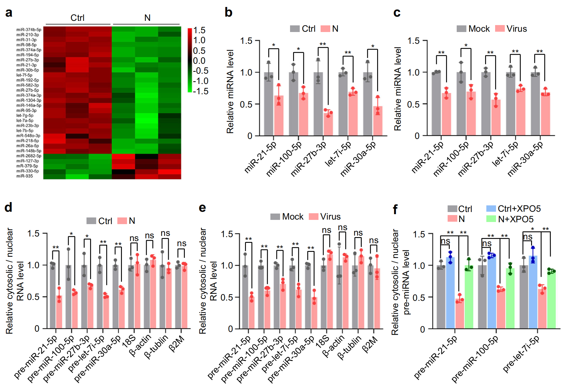 XPO5和Dicer在 miRNA 生物合成中起關(guān)鍵作用,小 RNA 深度測序顯示,N 蛋白誘導(dǎo) miRNA 表達的整體下調(diào),對 A549 和 BEAS-2B 細胞中表達量最高的前五個 miRNA進行定量驗證顯示,它們在表達 N 蛋白的細胞和 SARS-CoV-2 感染的細胞中均下調(diào);生化分級分離實驗顯示,異位 N 蛋白表達或 SARS-CoV-2 感染誘導(dǎo) pre-miRNA 的核保留,如細胞核中 pre-miRNA 水平的增加和細胞質(zhì)中 pre-miRNA 水平的降低所示,?XPO5過表達后得到緩解。此外,異位 N 蛋白表達或 SARS-CoV-2 感染降低了成熟 miRNA 和 pre-miRNA 之間的比率,Dicer過表達后得到緩解。總體而言,這些發(fā)現(xiàn)表明,N 蛋白通過降低?XPO5?表達阻斷 pre-miRNA 從細胞核到細胞質(zhì)的運輸,并通過下調(diào)?Dicer?表達抑制 pre-miRNA 向成熟 miRNA 的加工。
