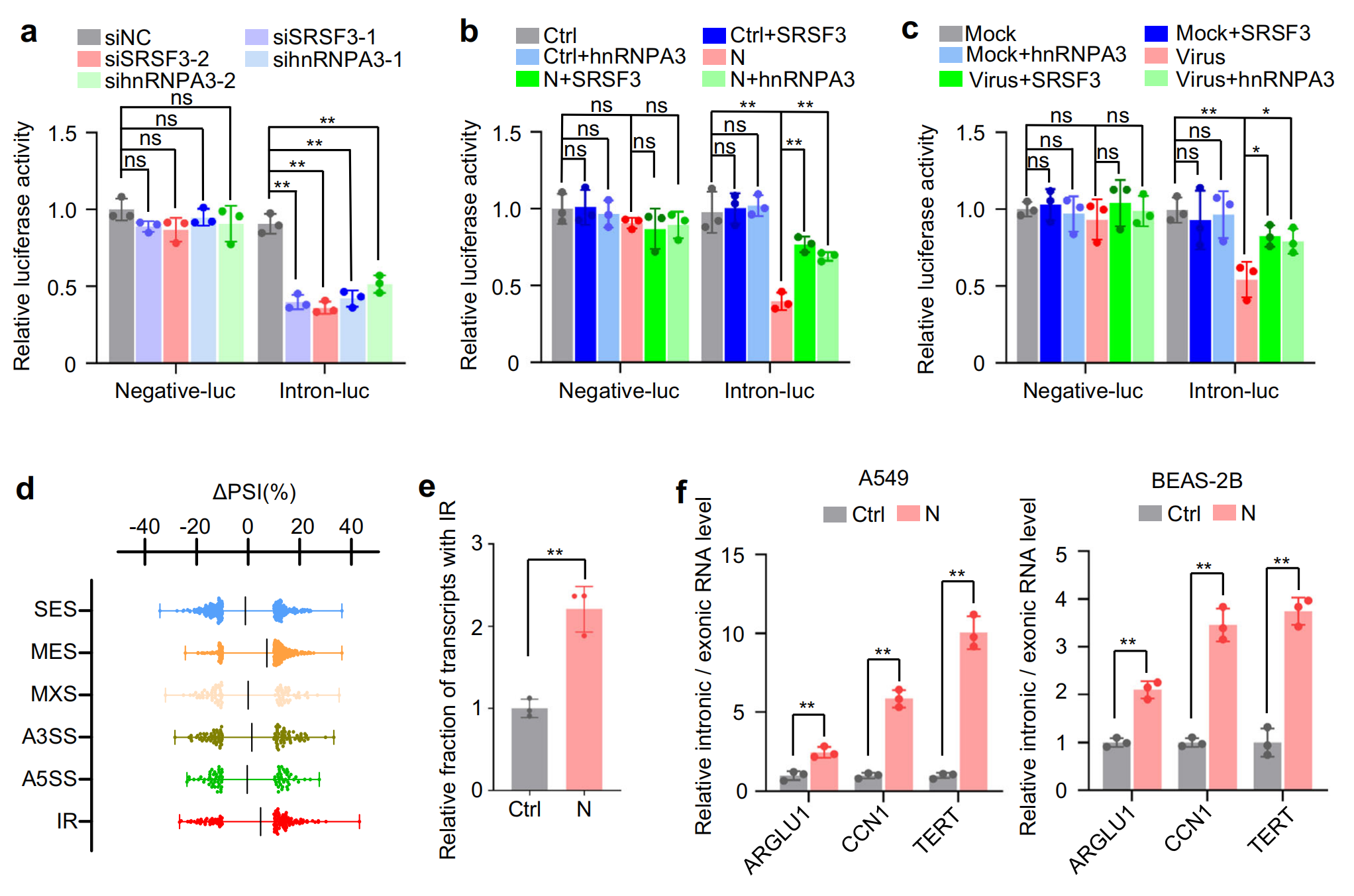 SRSF3或hnRNPA3敲除抑制了含有內(nèi)含子的報告基因小基因的剪接,證實了它們確實是剪接因子,而它們的過表達部分緩解了 N 蛋白或 SARS-CoV-2 感染對 RNA 剪接的抑制作用,進一步進行全長轉(zhuǎn)錄組測序,通過可變剪接分析發(fā)現(xiàn),N 蛋白誘導(dǎo)內(nèi)含子保留。此外,RT-qPCR證實,異位 N 蛋白表達或 SARS-CoV-2 感染降低了一組內(nèi)源性內(nèi)含子的剪接效率,SRSF3?和?hnRNPA3?過表達部分減輕了 N 蛋白和 SARS-CoV-2 對 RNA 剪接的抑制作用,這些結(jié)果表明,N 蛋白通過降低?SRSF3?和?hnRNPA3?的表達來抑制 RNA 剪接。
