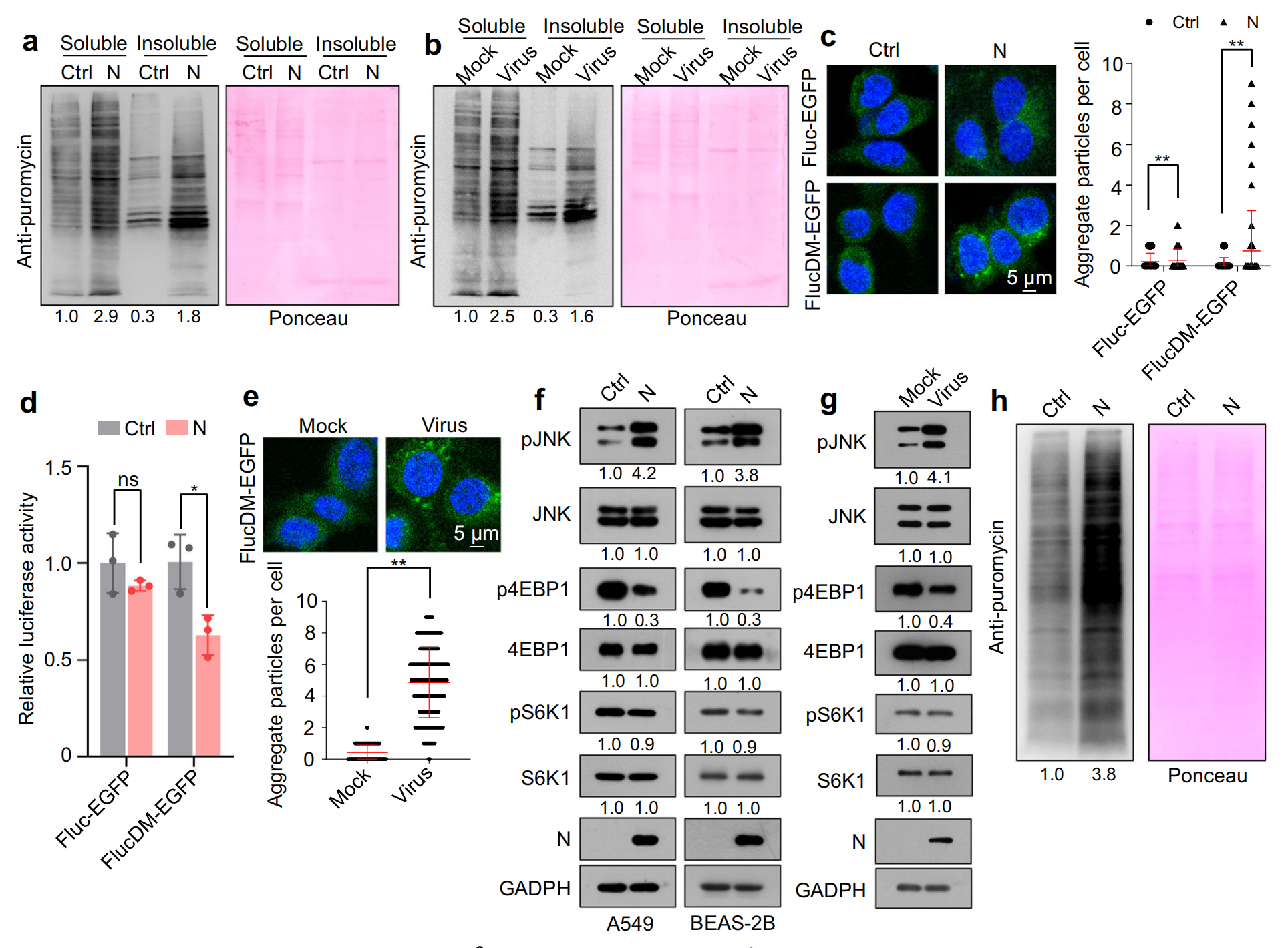 剪接抑制會誘導(dǎo)廣泛的 IR 和隨后的內(nèi)含子保留 mRNA 的翻譯,一部分內(nèi)含子衍生的多肽容易縮合且具有蛋白毒性,用嘌呤霉素對新生多肽進行代謝標記,結(jié)果顯示異位 N 蛋白表達或 SARS-CoV-2 感染誘導(dǎo)不溶性蛋白合成增加,而N蛋白與RNA的結(jié)合主要在可溶性蛋白部分被檢測到,免疫熒光檢測結(jié)果表明,N 蛋白和 SARS-CoV-2 感染誘導(dǎo)了 EGFP 聚集體的產(chǎn)生,誘導(dǎo)蛋白毒性應(yīng)激。