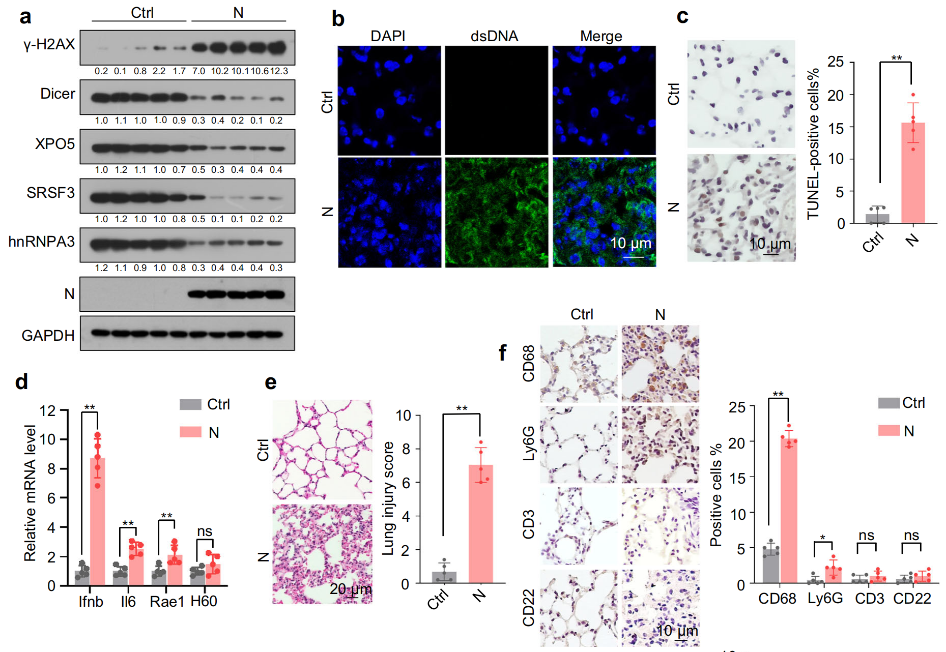 小鼠體內(nèi)驗證結(jié)果顯示, N 蛋白在小鼠肺組織中的表達導(dǎo)致?Dicer、XPO5、SRSF3?和?hnRNPA3?下調(diào)、DNA 損傷、胞質(zhì) DNA 積累、細胞凋亡、IFNβ、IL-6 和 NKG2D 配體上調(diào),以及伴有明顯巨噬細胞浸潤的肺炎,肺組織中?Dicer、XPO5、SRSF3?和?hnRNPA3?敲低導(dǎo)致肺損傷和肺炎,而它們的過表達部分緩解了 N 蛋白誘導(dǎo)的肺炎,這些結(jié)果表明,N 蛋白誘導(dǎo)的?Dicer、XPO5、SRSF3?和?hnRNPA3?蛋白表達下調(diào)是 SARS-CoV-2 誘導(dǎo)肺炎的一種機制。