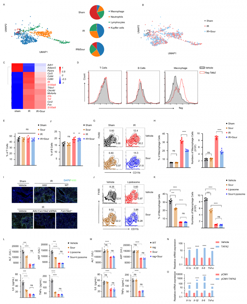 體外實驗發(fā)現(xiàn)TAFA2不引起肝細胞凋亡;snRNA-seq數(shù)據(jù)顯示IRI肝中巨噬細胞比例增加且炎癥相關(guān)基因表達水平增加,但在酸刺激組中降低;流式細胞術(shù)實驗結(jié)果表明,TAFA2與巨噬細胞結(jié)合而不與T/B細胞結(jié)合,不論是否酸刺激T/B細胞比例無顯著變化,IRI肝中CD11b+F4/80low?巨噬細胞增加而酸刺激可降低該巨噬細胞數(shù)量;TAFA2敲除或敲低抑制IRI肝中巨噬細胞的浸潤,這些結(jié)果表明TAFA2促進巨噬細胞活化。體外實驗結(jié)果表明,TAFA2可以激活BMDM(骨髓來源巨噬細胞),引起Il1α,Il1β,Il6和Tnfα的表達,這些結(jié)果表明TAFA2激活的巨噬細胞介導(dǎo)了肝IRI。