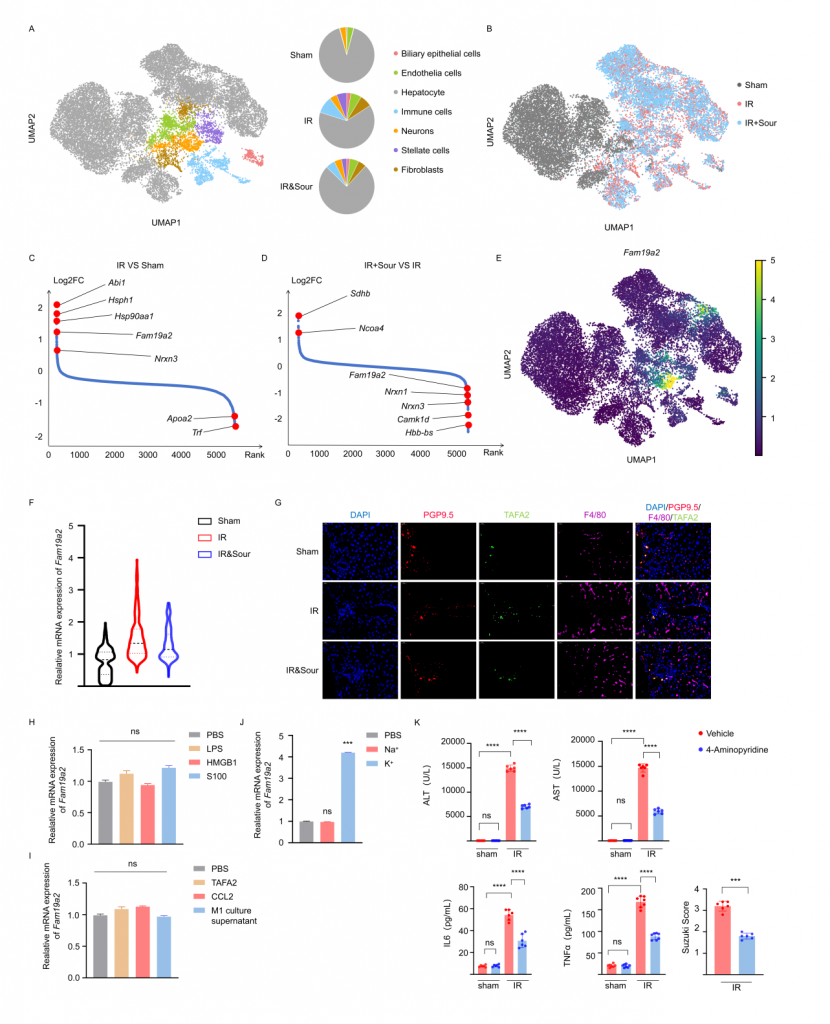 對肝IRI小鼠、酸刺激后肝IRI小鼠及sham(假手術(shù))小鼠的肝臟和CG進行單細胞核轉(zhuǎn)錄組測序,結(jié)果顯示IRI引起肝細胞和神經(jīng)元基因表達譜發(fā)生變化,IRI肝中免疫細胞數(shù)量增加,但酸刺激后IRI樣本中免疫細胞數(shù)量減少。神經(jīng)元較為特異性地表達TAFA2,IRI可引起肝神經(jīng)元TAFA2表達水平增加,但酸刺激使得TAFA2表達水平降到與sham對照組相近水平。實驗發(fā)現(xiàn)鉀離子可引起小鼠海馬神經(jīng)元細胞系HT22顯著高表達TAFA2,使用鉀離子通道抑制劑可減輕肝損傷,支持酸刺激通過神經(jīng)系統(tǒng)減輕肝損傷的假設(shè)。進一步的,使用慢病毒敲低神經(jīng)元TAFA2表達水平或使用TAFA2敲基因鼠,發(fā)現(xiàn)IRI引起的肝組織損傷、巨噬細胞浸潤以及血清標志物水平降低,表明TAFA2在肝IRI中有著重要作用。