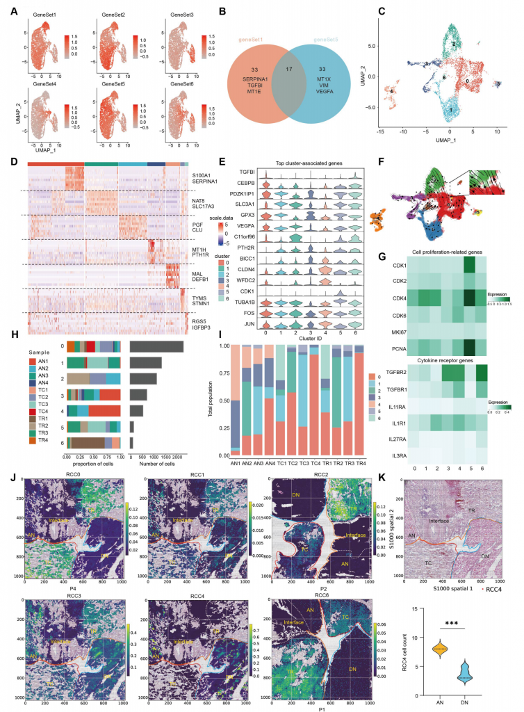 在這項研究中,作者在 GDs 14-16 (稱為 N14-16) 上使用正常的 Wistar 大鼠胚胎,在 GDs 14-16 (稱為 A14-16) 上使用 ETU 誘導(dǎo)的 ARM 胚胎進行空間轉(zhuǎn)錄組測序。制備大鼠胚胎的 6 個冷凍中矢狀切片,每個 10 μm 厚。這些切片包括尿道和后腸層,提供了特定時間點泄殖腔發(fā)育的全面視圖(圖 1A)。使用 10× Genomics Visium 空間轉(zhuǎn)錄組技術(shù),然后進行組織透化、cDNA 合成和文庫構(gòu)建,作者成功地捕獲了正常和 ARM 胚胎中的視覺基因轉(zhuǎn)錄數(shù)據(jù),主要來自泄殖腔區(qū)域。為了確保來自同一區(qū)域的各種切片樣本之間的可比性和一致性,作者進行了聚類注釋,產(chǎn)生了七個不同的聚類。這些集群包括泄殖腔區(qū)域內(nèi)的五個特定區(qū)域(集群 0-4),即尿道、后腸、膀胱、URS 和生殖器結(jié)節(jié)。此外,兩個簇 (簇 5 和 6) 對應(yīng)于椎體和神經(jīng)管區(qū)域 (圖 1A)。平均而言,每個解剖區(qū)域覆蓋 3005 個點,每個點捕獲 16,905 個基因(圖 1B)。