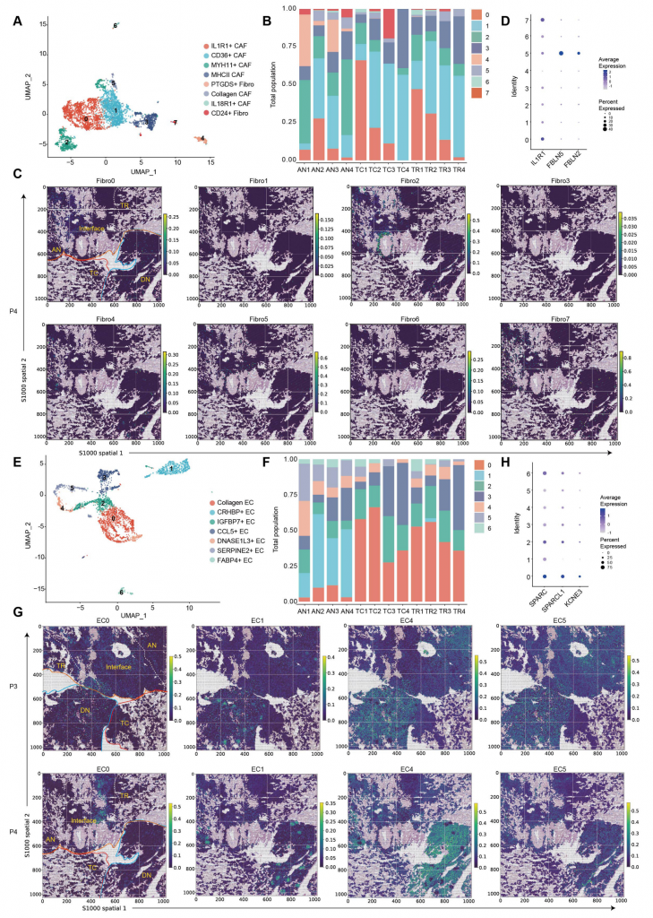 對海馬育兒袋7個發(fā)育階段進行單細胞轉(zhuǎn)錄組測序,鑒定出14個細胞簇,分為四大主要細胞類型:上皮細胞(EPCs,9個簇)、成纖維細胞(FBs,2個簇)、免疫細胞(ICs,2個簇)和內(nèi)皮細胞(ENCs,1個簇)。細胞的空間分布對細胞間相互作用及其功能維持至關(guān)重要。