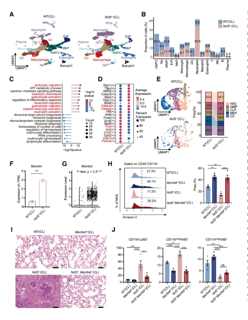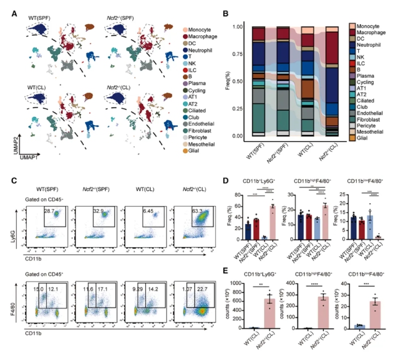 通過單細胞RNA測序和流式細胞術(shù)分析發(fā)現(xiàn)CGD小鼠肺部炎癥微環(huán)境以髓系細胞浸潤為主,提示其參與肉芽腫形成。其中單細胞測序,最終保留了25296個高質(zhì)量細胞樣本,每個細胞平均包含6466條比對讀數(shù)和1972個基因,并識別出9種免疫細胞類型及九種基質(zhì)細胞類型。還發(fā)現(xiàn)一個以細胞周期相關(guān)基因(Mki67和Top2a)高表達為特征的細胞簇。通過流式細胞術(shù)分析發(fā)現(xiàn),CL?Ncf2?/?小鼠中CD11b高表達的F4/80+MDMs在比例和絕對數(shù)量上均顯著增加,這些結(jié)果揭示了慢性肉芽腫性葡萄膜炎(CGD)小鼠在肺部感染過程中免疫細胞組成的顯著變化,尤其是中性粒細胞和MDMs的明顯聚集現(xiàn)象。