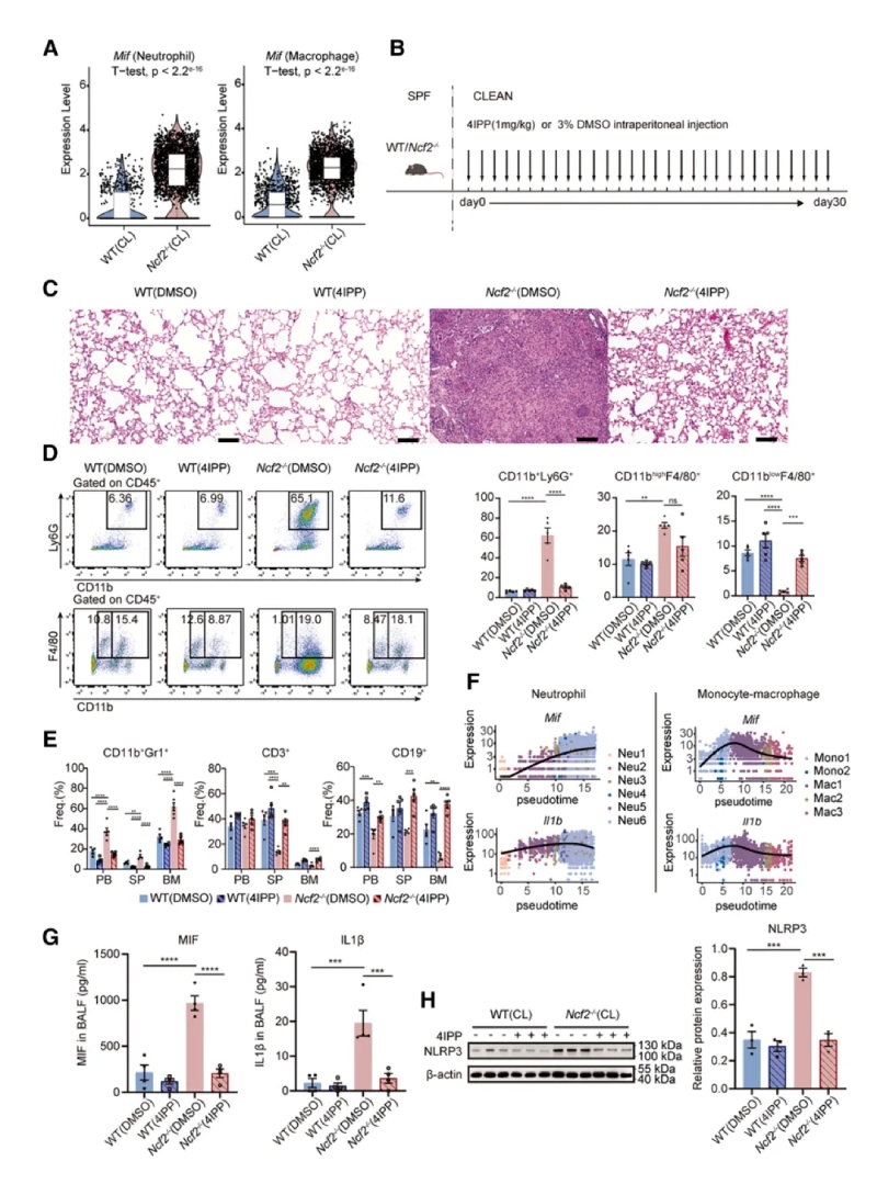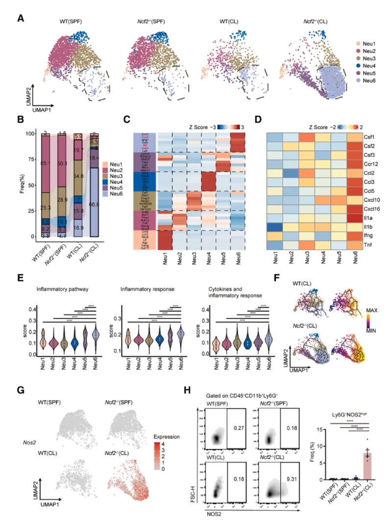 研究顯示,中性粒細胞分為6個亞群,其中Neu6亞群在CL?Ncf2?/?小鼠中顯著擴增且Neu6高表達促炎基因(如Nos2、Mif、Tnf、Il1b)。NO是一種在病原體清除過程中起關(guān)鍵作用由NOS2合成的可擴散小分子,CL?Ncf2?/?小鼠肺部的總NO生成量顯著升高。流式驗證顯示CL?Ncf2?/?小鼠肺中NOS2high中性粒細胞比例顯著增加。這些結(jié)果均提示NOS2high中性粒細胞通過產(chǎn)生一氧化氮(NO)和促炎因子,驅(qū)動肉芽腫核心區(qū)的炎癥反應(yīng)。
