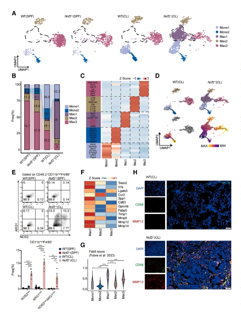 通過對巨噬細胞亞群進行聚類分析和功能富集,發(fā)現(xiàn)巨噬細胞分為5個亞群,Mac1亞群在CL?Ncf2?/?小鼠中顯著增加。Mac1同時表達M1(Nos2)和M2(Arg1)標志物,以及促纖維化基因(如Mmp12、Spp1)。免疫熒光顯示MMP12+巨噬細胞特異性分布于肉芽腫外圍。以上結(jié)果提示MMP12+巨噬細胞具有混合表型,可能通過細胞外基質(zhì)重塑促進肉芽腫的纖維化包裹。