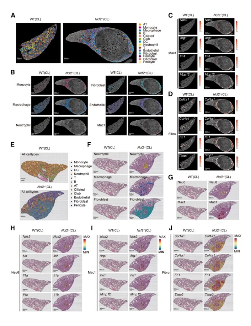 研究總結(jié)首次通過環(huán)境暴露構(gòu)建自然CGD模型,結(jié)合多組學(xué)技術(shù)解析肉芽腫的細胞和分子機制。本研究揭示了CGD肉芽腫中NOS2high中性粒細胞和MMP12+巨噬細胞的協(xié)同作用,并提出MIF和Morrbid作為潛在治療靶點,為CGD的精準干預(yù)提供了理論基礎(chǔ)。BMKMANU?S1000空間轉(zhuǎn)錄組通過高分辨率空間定位明確揭示了中性粒細胞(Neu6亞群)在肉芽腫核心、巨噬細胞(Mac1亞群)和成纖維細胞在外圍的分布。在基因表達驗證時確認了NOS2、MIF、IL-1β等基因在肉芽腫不同區(qū)域的差異表達,這一結(jié)果與scRNA-seq結(jié)果高度一致,展示了BMKMANU?S1000在疾病微環(huán)境研究中的高效性。