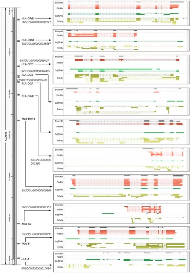 Figure 4.基因通過PacBio所測轉(zhuǎn)錄本和組裝得到的轉(zhuǎn)錄本還原10個MHC基因。染色體定位、命名和每個基因的Ensembl編號(在左側(cè))。