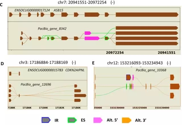PacBio鑒定到多達24,797個AS事件,并對這些可變剪接進行分類統(tǒng)計(Table 1),在兔的參考基因組中僅發(fā)現(xiàn)2,398個AS事件,將數(shù)據(jù)合并后共得到34,173個AS事件,且可變剪接事件包含不同的4中類型,另外,鑒定到11,184個APA事件。挑選5個基因,并用圖表示出不同的isoform比對到參考基因模型上(Figure 2)。
