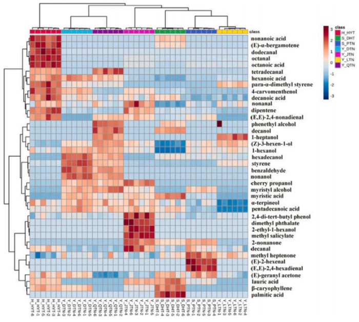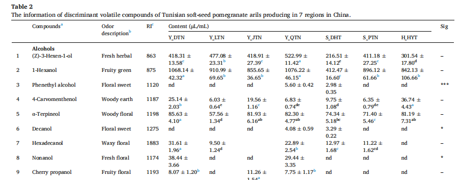 7個產(chǎn)區(qū)突尼斯軟籽石榴揮發(fā)性化合物的熱圖:風(fēng)味譜、糖、有機(jī)酸和維生素c含量存在顯著差異。所有石榴花粒中共鑒定出40種揮發(fā)性化合物,其中醇、醛、酸和二戊烯是影響石榴香氣品質(zhì)主要因素。