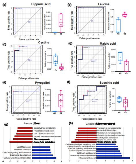 MG中的馬來酸(AUC=0.972,log2FC=-2.88;圖3d),鄰苯三酚(AUC=0.833,log2FC=6.26;圖3e)和琥珀酸(AUC=0.833,log2FC=-3.01;圖3f)是分離AH和CS動物的潛在生物標(biāo)記。通過IPA識別,CS喂養(yǎng)的奶牛的肝臟中關(guān)鍵顯著下調(diào)的途徑是氨基酸(AA)代謝(P=1.66E-07,Z評分=-3.12),糖異生(P=3.86E-08,Z評分=-2.61))以及肝臟中的維生素和礦物質(zhì)代謝(P=1.47E-15,Z分?jǐn)?shù)=-2.42)(圖3g);MG中AAs的攝?。≒=1.49E-08,Z分?jǐn)?shù)=-2.77),攝取L-AA(P=4.52E-07,Z分?jǐn)?shù)=-2.41),碳水化合物代謝(P=2.10E-11,Z分?jǐn)?shù)=-2.24)和葡萄糖-6-磷酸的氧化(P=1.01E)-11,Zscore=-2.21)途徑顯著下調(diào)。(圖3h)