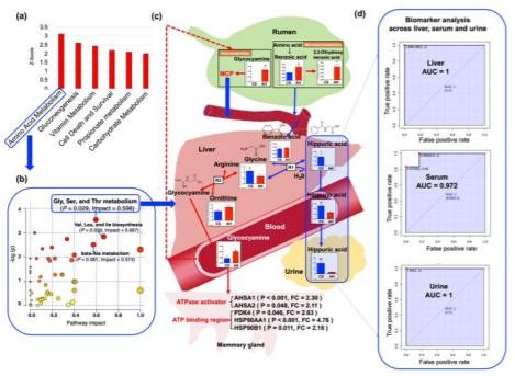 在兩個動物組之間,AA代謝途徑是肝臟中最顯著不同的途徑(圖5a)。對AA代謝途徑的進(jìn)一步影響分析表明,亞途徑,甘氨酸,絲氨酸和蘇氨酸代謝的影響較大(圖5b,P=0.029,影響值=0.597)。因此,我們對肝臟中與甘氨酸相關(guān)的反應(yīng)進(jìn)行了徹底的分析,并研究了它們與體內(nèi)體液中代謝物的關(guān)系。綜合比較表明,苯甲酸,糖胺(GAA)和HCA在整個人體的AA代謝中起著關(guān)鍵作用,當(dāng)母牛飼喂CS時,隨后會影響牛奶的合成(圖5c)。用CS喂養(yǎng)的奶牛肝臟中甘氨酸和HCA的濃度更高,進(jìn)一步支持了我們的推測,即瘤胃(微生物)和肝臟(宿主)中的苯甲酸代謝都可能受到影響(圖5c)。對肝,血清和尿液進(jìn)行的HCA生物標(biāo)志物分析顯示出一致的結(jié)果(圖5d),這進(jìn)一步表明,從肝臟到尿液的HCA循環(huán)是CS下牛奶產(chǎn)量變化的生物標(biāo)志物。