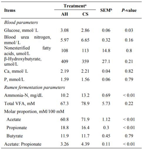 Table 1. The blood and rumen fermentation parameters in the dairy cows fed with alfalfa hay and corn stover based diets.