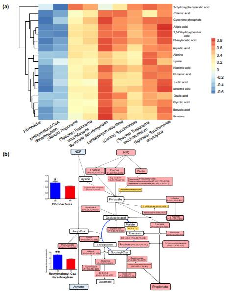 瘤胃液中55種明顯不同的代謝產(chǎn)物中,CS喂養(yǎng)的動物中49種的代謝產(chǎn)物含量較低,通過將微生物分類群相對豐度,碳水化合物代謝中的基因豐度和17種高度豐富的微生物代謝物相關(guān)聯(lián),研究了微生物代謝物與微生物之間的關(guān)系。核心宏基因組相關(guān)元素包括三個細(xì)菌屬(纖維桿菌,琥珀酸桿菌和螺旋體)),三種細(xì)菌種類(解淀粉琥珀酸桿菌,琥珀酸梅毒螺旋體和嗜糖鏈球菌)和三種微生物功能(甲基丙二酰輔酶A脫羧酶,琥珀酸脫氫酶和乳醛還原酶)(圖2a)。琥珀酸脫氫酶基因和解淀粉鏈球菌的相對豐度分別與16種代謝物(r介于0.43至0.68,P<0.1)和15種代謝物(r介于0.43至0.76,P<0.1)呈正相關(guān)。對上述瘤胃代謝組和代謝組的綜合分析顯示,當(dāng)給動物喂食CS時,瘤胃中產(chǎn)生較低的丙酸根和較高的乙酸鹽的潛在機(jī)理(圖2b)。
