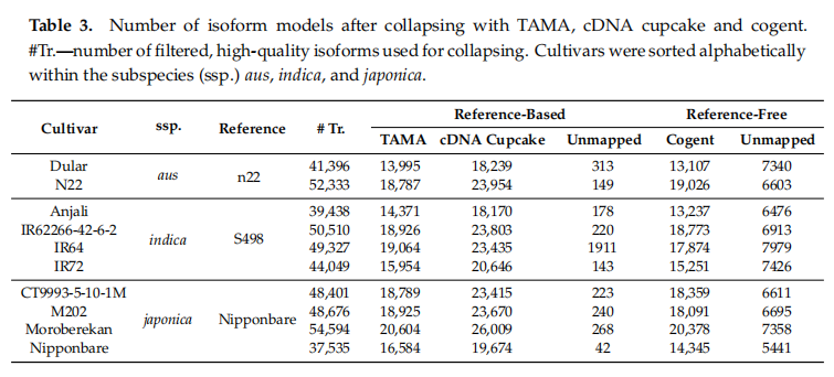在文庫(kù)準(zhǔn)備過(guò)程中,會(huì)產(chǎn)生5 ‘ RNA降解產(chǎn)物,并進(jìn)行測(cè)序。這些降解產(chǎn)物具有相同的外顯子結(jié)構(gòu),但缺乏5 ‘序列信息,因此產(chǎn)生與技術(shù)偏差或生物學(xué)背景無(wú)關(guān)的冗余異構(gòu)體。我們測(cè)試了三種不同的去冗余方法,包括cogent、cDNA cupcake和TAMA,其中cDNA cupcake和TAMA需要基于參考基因組,而cogent不需要基于參考基因組。cogent基于pacbio全長(zhǎng)轉(zhuǎn)錄本序列重構(gòu)一個(gè)參考基因組,然后將相同的序列比對(duì)到重建的基因組,基于比對(duì)結(jié)果利用cDNA cupcake算法對(duì)轉(zhuǎn)錄本去冗余。cDNA cupcake和TAMA直接用minimap2軟件和各自的亞種參考基因組進(jìn)行比對(duì)?;谶@三種方法,只有很少的轉(zhuǎn)錄本不能回比到基因組上(表3)。總的來(lái)說(shuō),這三種去冗余方法均能顯著減少異構(gòu)體的數(shù)量,分別為47.6% (cDNA cupcake,Nipponbare)和68.3%(cogent,Dular)。