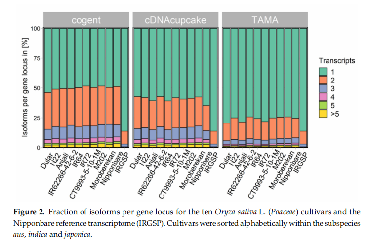 去冗余后轉(zhuǎn)錄本長(zhǎng)度中值都有所增長(zhǎng),長(zhǎng)度分布和轉(zhuǎn)錄本長(zhǎng)度中值與Nipponbare參考基因組相似。統(tǒng)計(jì)了去冗余后10個(gè)品種每個(gè)基因相應(yīng)的轉(zhuǎn)錄本數(shù)量,其中基因只有一個(gè)轉(zhuǎn)錄本的比例,TAMA最高達(dá)到了75%,cDNA cupcake在60%左右,cogent只有50%。同時(shí)計(jì)算了Nipponbare參考基因組每個(gè)基因?qū)?yīng)的轉(zhuǎn)錄本數(shù)量進(jìn)行比較,該參考基因中基因只有一個(gè)轉(zhuǎn)錄本的比例達(dá)到了85%(圖2)。