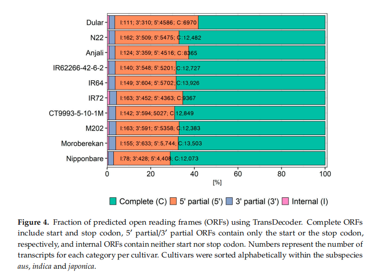 在過(guò)去的幾年里,RNA測(cè)序(特別是基于illumina的短序列RNA-seq)已經(jīng)成為分析轉(zhuǎn)錄組的有力工具,用來(lái)識(shí)別在非脅迫控制和各種環(huán)境脅迫條件下差異表達(dá)的基因。然而,需要基于參考基因組或轉(zhuǎn)錄組序列對(duì)RNA-seq數(shù)據(jù)進(jìn)行比對(duì)和注釋來(lái)確定轉(zhuǎn)錄水平。在水稻中,參考基因組決定了可以鑒別的差異表達(dá)基因和轉(zhuǎn)錄本亞型。顯然,參考基因組/轉(zhuǎn)錄組中沒(méi)有的基因的表達(dá)信息在分析過(guò)程中會(huì)丟失。這在研究耐脅迫的外來(lái)品種、陸地品種或野生稻種時(shí)尤其相關(guān),因?yàn)樗鼈兛赡芎袇⒖计贩NNipponbare不存在的耐受基因。這將嚴(yán)重限制識(shí)別支持作物改良計(jì)劃的新候選基因的可能性。