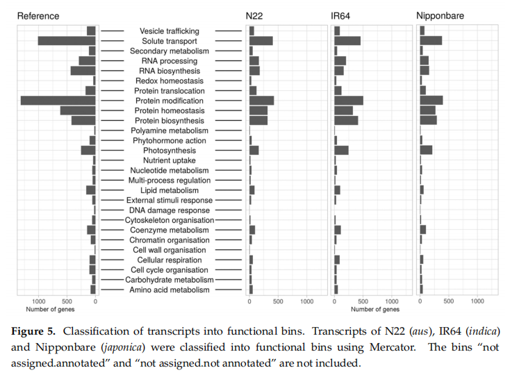 使用Trinotate和Mercator4進(jìn)行功能注釋。Mercator4是專(zhuān)門(mén)為植物開(kāi)發(fā)的,它使用了一種簡(jiǎn)單的層次樹(shù)結(jié)構(gòu),被稱(chēng)為“容器”,用來(lái)描述生物學(xué)概念。主要的生物過(guò)程如光合作用,都是由頂層的容器來(lái)表示的,每個(gè)子容器描述的是一個(gè)更詳細(xì)的子過(guò)程。目前本體包括27個(gè)功能類(lèi)別,代表了植物中不同的生物過(guò)程。N22、IR64和Nipponbare三個(gè)品種作為各自亞種的代表與植物中所有水稻基因的分類(lèi)進(jìn)行比較分析,結(jié)果顯示三個(gè)品種的注釋結(jié)果分布相似(圖5)。超過(guò)28000個(gè)水稻已知基因在Mercator庫(kù)中沒(méi)有注釋分類(lèi)信息,因此三個(gè)品種有8000~10000個(gè)轉(zhuǎn)錄本沒(méi)有分類(lèi)注釋到Mercator庫(kù)。