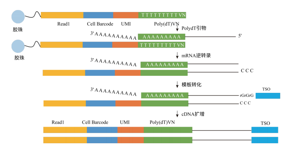 GEMs形成后,細(xì)胞裂解釋放出mRNA;同時膠珠也會自動溶解,釋放出大量含有Barcode序列的引物,并利用引物末端的Ploy(dT)VN序列捕獲液滴中的mRNA,并在一個個GEM中獨立完成mRNA逆轉(zhuǎn)錄,產(chǎn)生帶有Barcode和UMI信息的cDNA。隨后“油包水”結(jié)構(gòu)裂開,進(jìn)行cDNA擴(kuò)增。