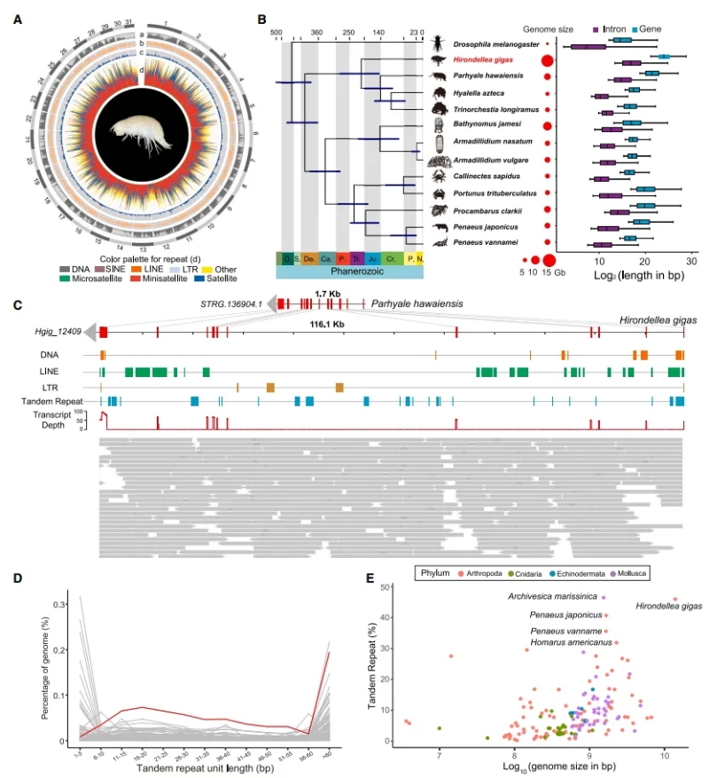 研究團(tuán)隊(duì)利用PacBio?HiFi長(zhǎng)讀長(zhǎng)測(cè)序和Hi-C三維基因組技術(shù),成功組裝了H.?gigas的染色體水平的高質(zhì)量基因組(大小13.92?Gb)?;蚪M分析揭示了其兩大主要特征:內(nèi)含子延長(zhǎng)和重復(fù)序列擴(kuò)張。與近緣物種相比,H.?gigas的內(nèi)含子長(zhǎng)度顯著增加,主要是由于重復(fù)序列的插入,尤其是串聯(lián)重復(fù)和長(zhǎng)散在重復(fù)序列(LINEs)轉(zhuǎn)座子。H.?gigas基因組中71.98%為重復(fù)序列,主要為串聯(lián)重復(fù),占到基因組的46.03%,顯著高于其他無(wú)脊椎動(dòng)物。特別是,與其他無(wú)脊椎動(dòng)物基因組相比,H.?gigas基因組中長(zhǎng)單元串聯(lián)重復(fù)序列(小衛(wèi)星,10-100?bp)的比例更高,其比例與無(wú)脊椎動(dòng)物基因組大小正相關(guān)。這些重復(fù)的產(chǎn)生可能與深淵極端環(huán)境的適應(yīng)有關(guān)。