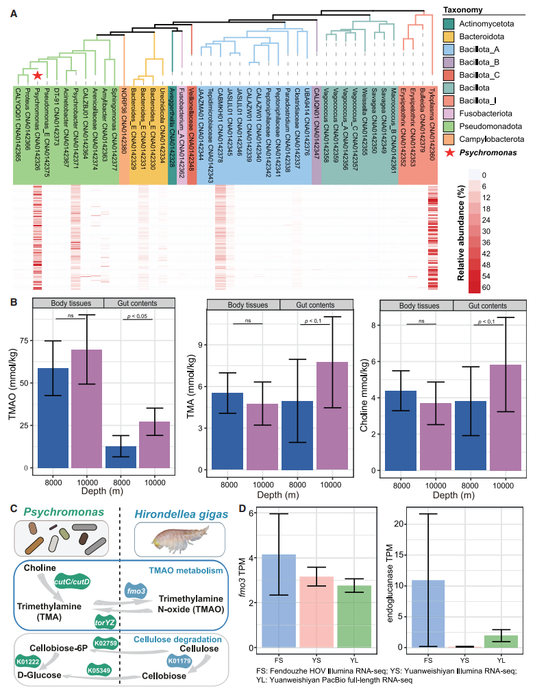 氧化三甲胺(TMAO)是一種滲透調(diào)節(jié)物質(zhì),在滲透壓調(diào)節(jié)以及在高靜水壓條件下維持細(xì)胞完整性方面發(fā)揮著重要作用。檢測(cè)發(fā)現(xiàn),隨著深度增加,鉤蝦腸道內(nèi)容物中TMAO濃度顯著升高,體組織中也呈現(xiàn)類似趨勢(shì)。鉤蝦自身編碼fmo3基因,可將三甲胺(TMA)轉(zhuǎn)化為TMAO。而其優(yōu)勢(shì)共生菌Psychomonas的基因組中攜帶cutC和cutD基因簇,可將膽堿分解為TMA;同時(shí)擁有torYZ操縱子,可以將TMAO還原為TMA,從而調(diào)控宿主體內(nèi)的TMAO濃度,形成動(dòng)態(tài)平衡。