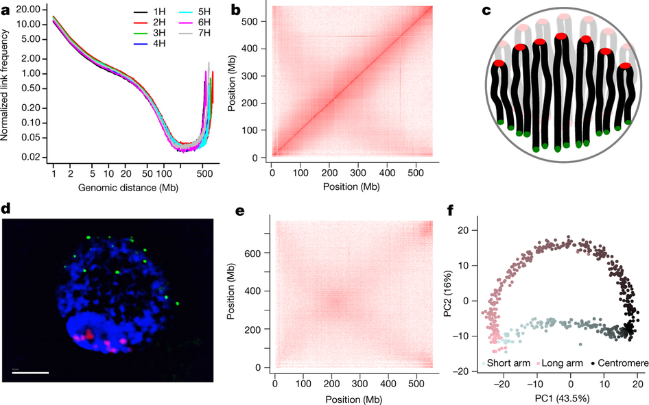 通過HIC熱圖作者發(fā)現(xiàn)無論是染色體內(nèi)部還是染色體間的長短臂之間都存在較強(qiáng)的交互信號。按照HIC的原理來說,染色體上空間作用越強(qiáng)則實(shí)際DNA間的物理距離越近,染色體大小臂及不同染色體間的相互作用應(yīng)該是極弱的。為了找出原因,作者通過對大麥葉核間期的細(xì)胞進(jìn)行著絲粒及端粒熒光雜交,發(fā)現(xiàn)所有染色體的端粒和著絲粒在空間上的位置都純在極性,且排列方式也極其相似,不同染色體間的大小臂其實(shí)在空間上距離很近,因此確實(shí)存在染色體內(nèi)外大小臂之間大量的交互作用的可能。