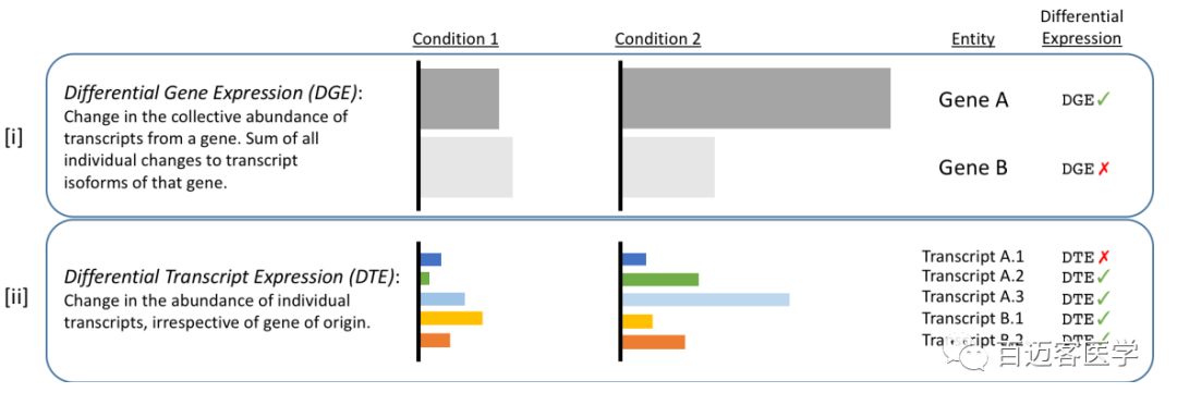 注:上圖列舉了2種情況下鑒定到的差異表達(dá)基因A和B,以及這2個基因鑒定到的各轉(zhuǎn)錄本差異表達(dá)情況。DGE表示差異表達(dá)基因,DTE表示差異表達(dá)轉(zhuǎn)錄本??梢?,對于B基因,雖然基因水平不顯著差異表達(dá),但是轉(zhuǎn)錄本水平,B.1和B.2都顯著差異表達(dá)。–[ref2]